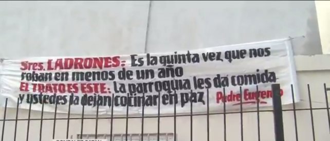 Tras sufrir cinco robos en menos del año el padre Eugenio colgó con pasacalles con un mensaje que reza: "Señores ladrones: es la quinta vez que nos roban en menos de un año. El trato es: la parroquia les da comida y ustedes la dejan cocinar en paz".