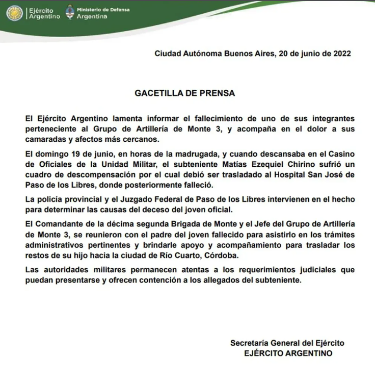 Un subteniente del Ejército Argentino de 22 años murió luego de una fiesta de iniciación