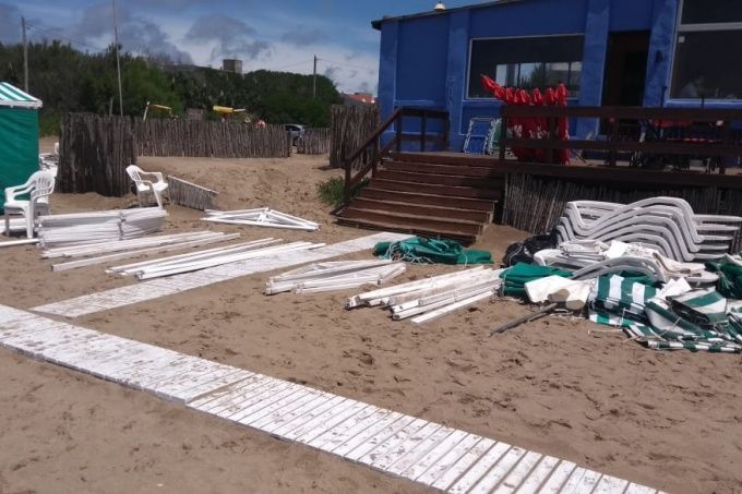 "Por suerte estamos todos a salvo que no es poco. La tormenta nos barrió más de medio balneario, 60 carpas y el plástico de casi todo el parador, nos destruyó juegos, lonas, rompió las maderas que sostienen las carpas. Supongo que fue una tromba, duró 10 minutos que fueron eternos", comentó Miguel Valerde, propietario de El Faro.