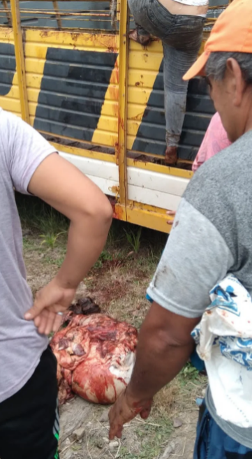 En cuestión de minutos, varios vecinos con cuchillos empezaron a carnear los animales, algunos de ellos atrapados en los hierros y la madera de la jaula que los transportaba.