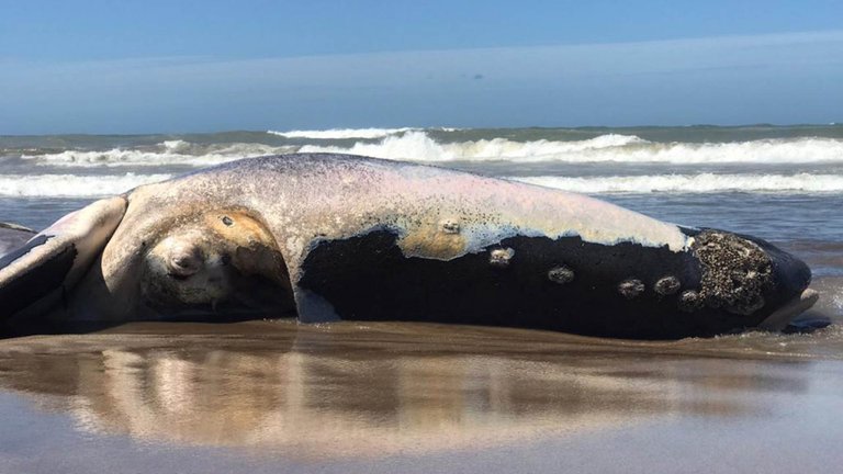 Una ballena franca austral macho apareció muerta hoy en una playa de Necochea. Por estas horas personal de la Dirección de Gestión Ambiental municipal trabaja en un operativo para poder lograr enterrarla en un pozo de cuatro metros de profundidad que le permita una descomposición natural.