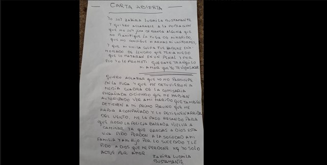 "Yo soy Zahira Ludmila Bustamante y quiero aclararle a la población que no soy jefa de banda alguna, que no planifiqué la fuga de mi marido y que no conseguí ni armas ni uniformes", comienza el escrito, difundido esta mañana y publicado en el canal de noticias A24.