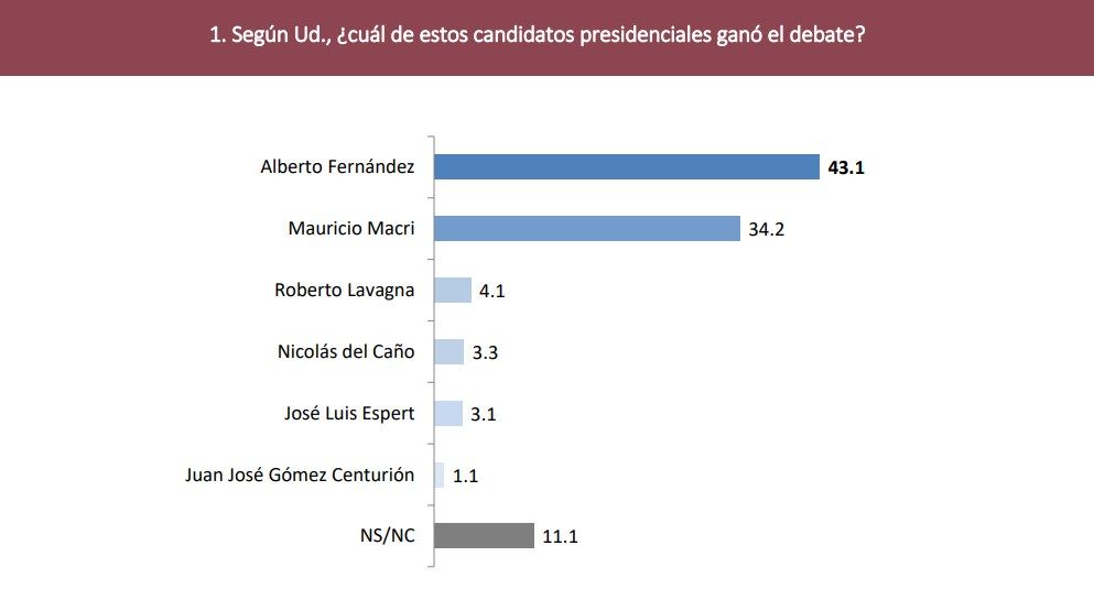 Según el estudio sobre 1.500 casos, el 43,1% de los consultados cree que Fernández ganó el debate, mientras que un 34,2% se inclinó por la exposición del presidente Macri.