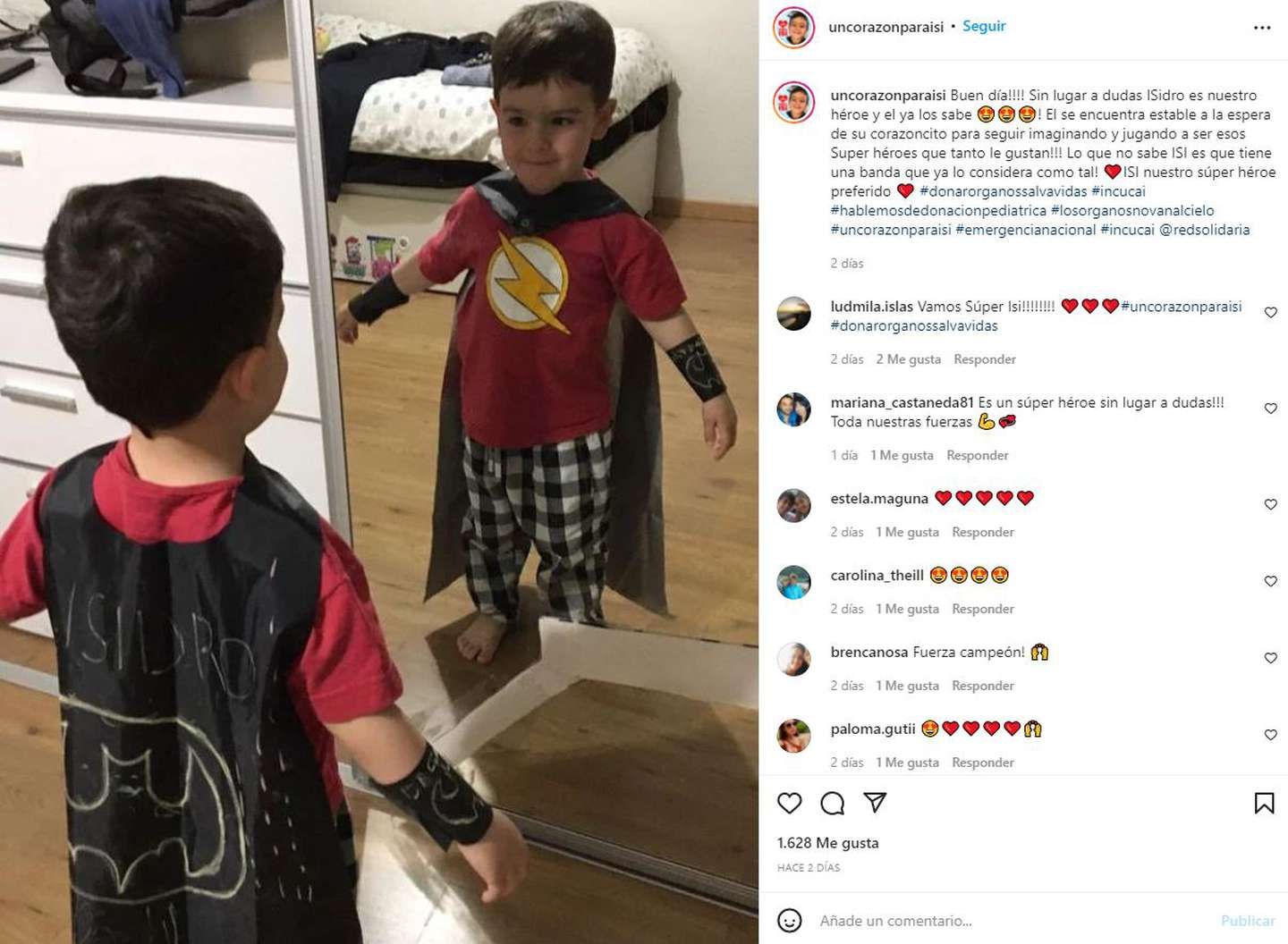 “Buen día!!!! Sin lugar a dudas Isidro es nuestro héroe y él ya los sabe! El se encuentra estable a la espera de su corazoncito para seguir imaginando y jugando a ser esos Super héroes que tanto le gustan!!! Lo que no sabe ISI es que tiene una banda que ya lo considera como tal!”, dice otro de los posteos, con Isidro con la capa de Batman y una remera de Flash.