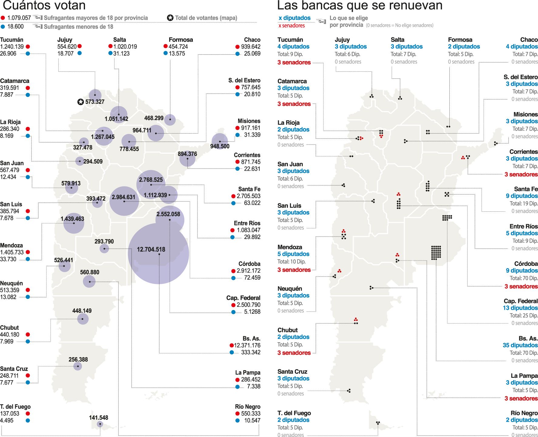 En el Senado, el oficialista FdT pondrá en juego 15 de las 41 bancas que le permiten superar el número necesario para el quórum, y Juntos por el Cambio (JxC) arriesgará nueve de sus 25 lugares.