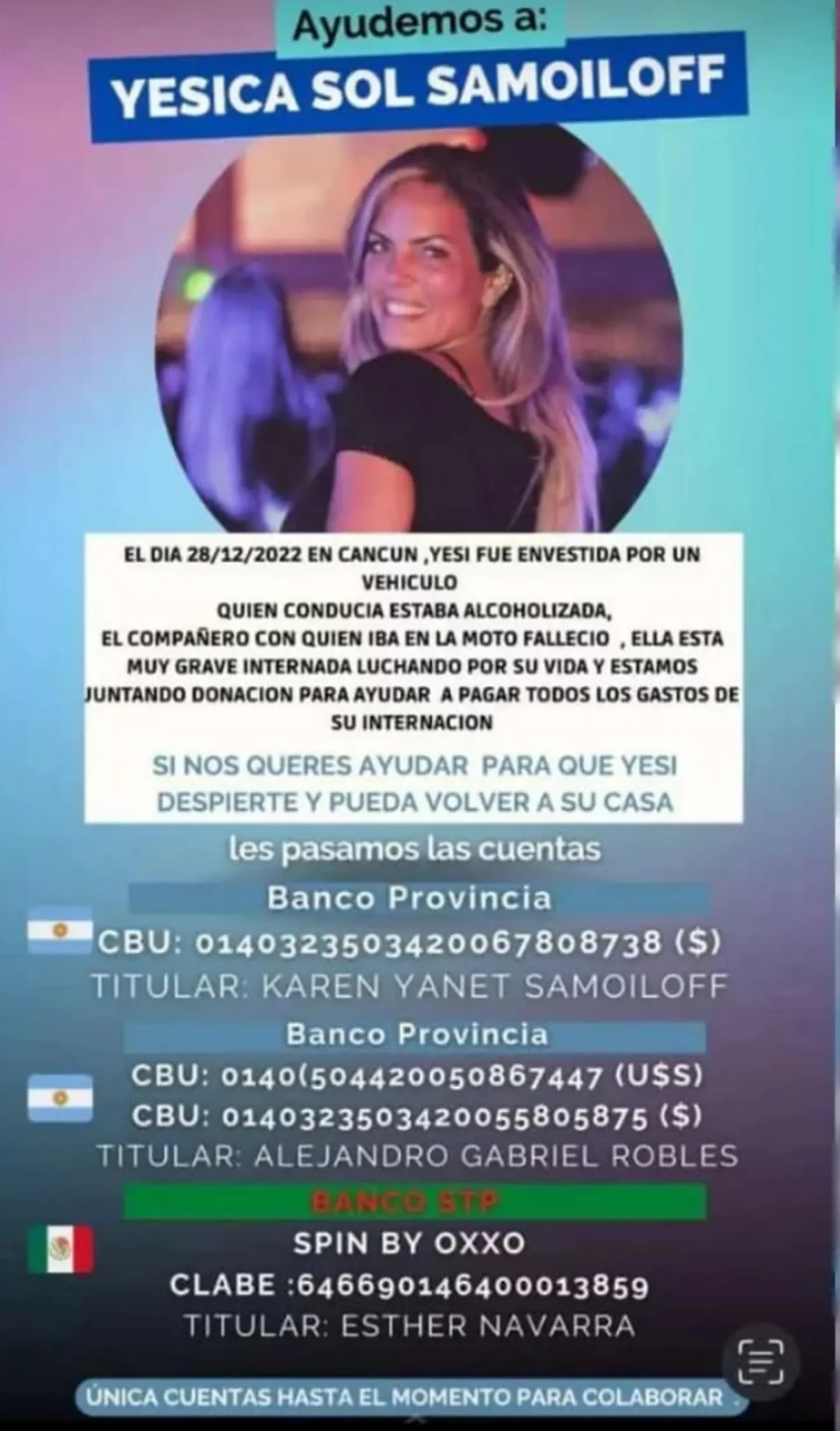 Se trata de Yésica Sol Samoiloff, quien quedó en coma tras el fuerte impacto que sufrió en el accidente. En medio de la dramática situación, su familia pide ayuda porque la joven no tenía seguro de viajero y no pueden afrontar los gastos médicos.