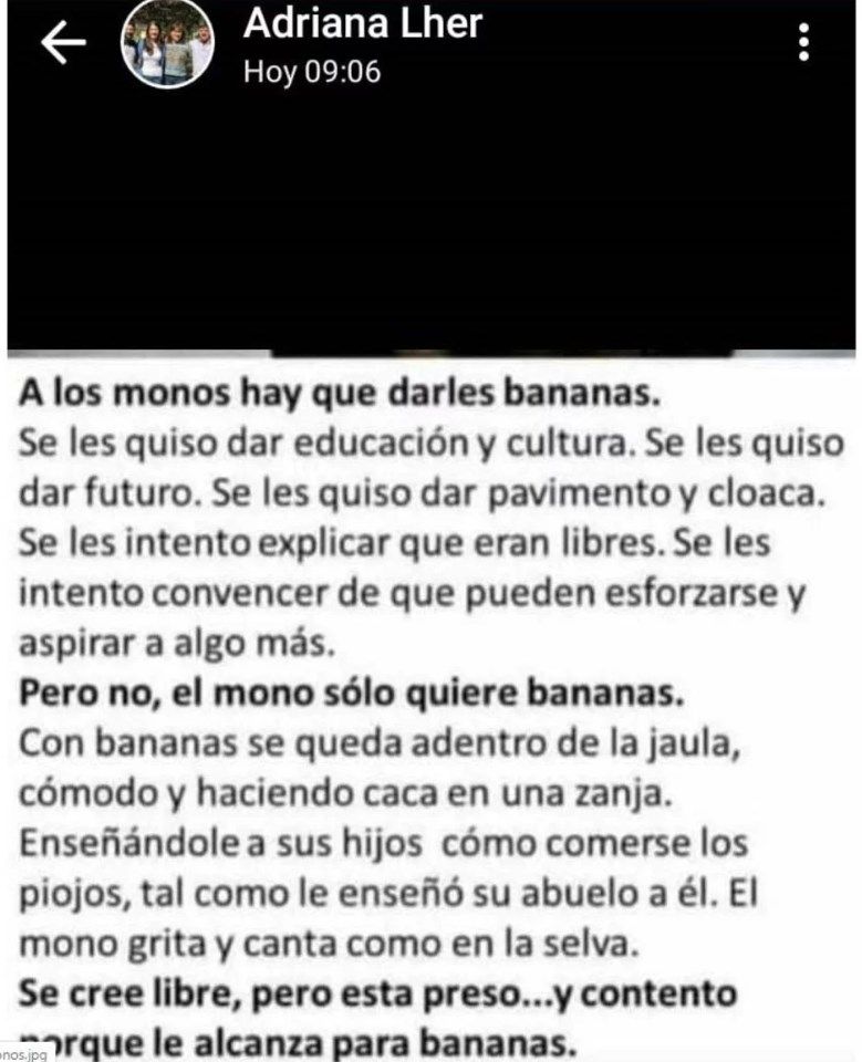 El texto, que replicaron en las redes sociales militantes del PRO, es el siguiente: "Se les quiso dar educación y cultura. Se les quiso dar futuro. Se les quiso dar pavimento y cloaca. Se les intentó explicar que eran libres. Se les intentó convencer de que pueden esforzarse y aspirar a algo más. Pero no, el mono solo quiere bananas. Con bananas se queda adentro de la jaula, cómodo y haciendo caca en una zanja. Enseñándole a sus hijos como comerse los piojos, tal como le enseñó su abuelo a él. El mono grita y canta como en la selva. Se cree libre, pero está preso… y contento porque le alcanza para bananas".
