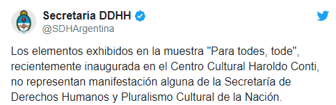 Sin embargo, la Secretaría de Derechos Humanos, se mostró en contra a la muestra a través de su cuenta de Twitter. “Los elementos exhibidos en la muestra “Para todes, tode”, recientemente inaugurada en el Centro Cultural Haroldo Conti, no representan manifestación alguna de la Secretaría de Derechos Humanos y Pluralismo Cultural de la Nación”, sostuvieron desde el organismo.