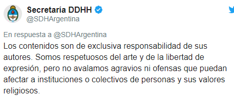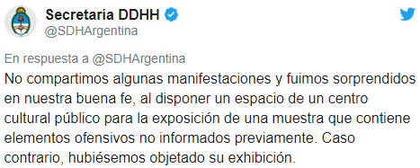 “No compartimos algunas manifestaciones y fuimos sorprendidos en nuestra buena fe, al disponer un espacio de un centro cultural público para la exposición de una muestra que contiene elementos ofensivos no informados previamente. Caso contrario, hubiésemos objetado su exhibición”, concluyeron desde la Secretaría que integra el Ministerio de Justicia y Derechos Humanos de la Nación Argentina.