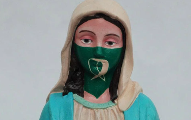 En la muestra de arte “Para todes, tode” se expone, entre otras obras de arte, a una Virgen luciendo el pañuelo verde, símbolo del pedido por la ley del aborto legal, seguro y gratuito.
