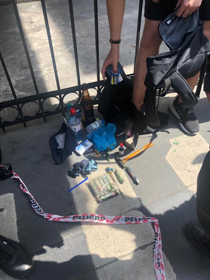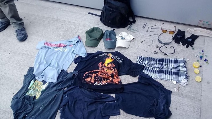La Policía de la Ciudad les solicitó que abrieran sus mochilas: tenían gran cantidad de bolitas de vidrio, bulones y tornillos, así como gajos de limón para aplicar en los ojos y aliviar los efectos de los gases lacrimógenos; el hallazgo fue comunicado a la Fiscalía Contravencional Zona Este, a cargo de Federico Tropea, que dispuso los arrestos", contaron.