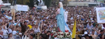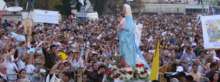 La muchedumbre agitó pañuelos y banderas de color blanco, lanzó pétalos de rosa y aplaudió en forma constante durante la ceremonia en la que el Obispo Cardelli le colocó la corona a la Virgen y al Niño Jesús.