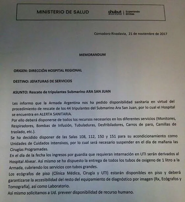 El ministro de Salud de la Provincia de Chubut, Ignacio Hernández emitió un protocolo de emergencia en el hospital de la ciudad de Comodoro Rivadaviaante la eventual llegada de los 44 tripulantes del submarino ARA San Juan que es intensamente buscado en la plataforma submarina enfrente a este distrito.