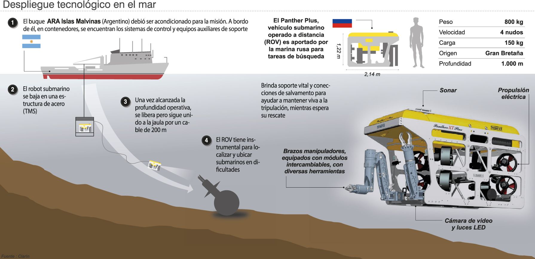 El vocero de la Armada, en una segunda rueda de prensa por la tarde, precisó que los tres “contactos” están a 700, 800 y 900 metros de profundidad y serán inspeccionados por el ROV ruso Panter Plus, embarcado en el navío ARA “Islas Malvinas” y chequeados en la Base naval de Puerto Belgrano.