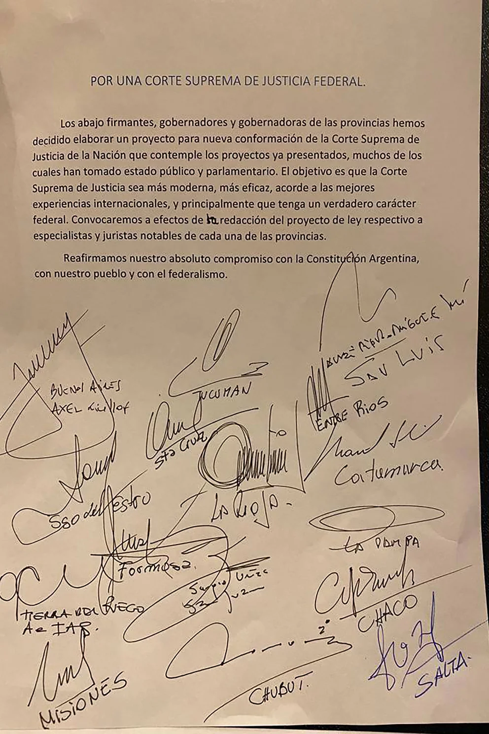 El texto indica: “Los abajo firmantes, gobernadores y gobernadoras de las provincias, hemos decidido elaborar un proyecto para nueva conformación de la Corte Suprema de Justicia de la Nación que contemple los proyectos ya presentados, muchos de los cuales han tomado estado público y parlamentario”.