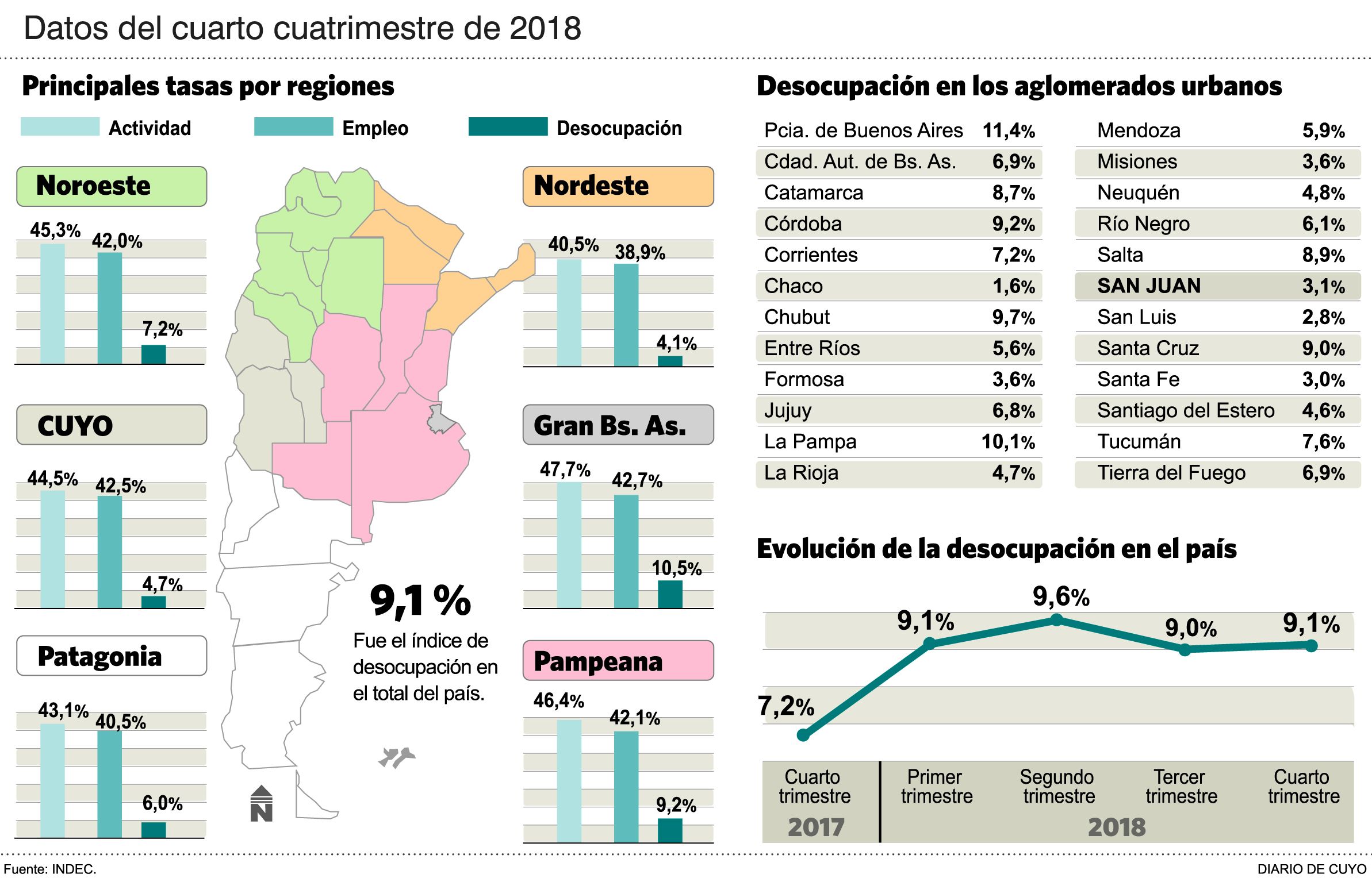 El dato relevante del informe del Indec tiene como protagonista a la provincia de San Juan: aquí el desempleo del cuarto trimestre de 2018 fue de 3,1%, es decir, tres veces menos que la media nacional. Respecto del cuatro trimestre de 2017, la tasa de desocupación también bajó en San Juan ya que en la comparación interanual se anotó una reducción del 1,7%. Es decir que pasó del 4,8% al 3,1. En cambio, si se lo compara con el trimestre inmediatamente anterior (tercero de 2018) hubo un alza ya que pasó del 2 al 3,1%.