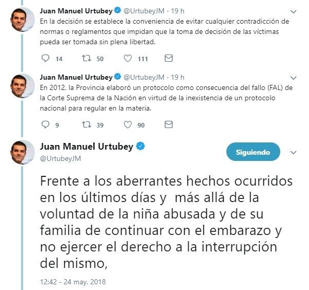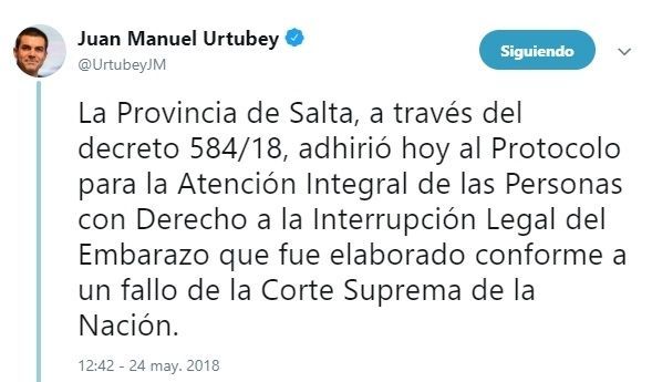 Sin embargo, el gobernador de Salta, Juan Manuel Urtubey, firmó un decreto por el cual adhiere al protocolo nacional sobre aborto no punible, y de esta manera habilitó la interrupción del embarazo de la nena de 10 años.