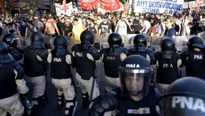 Los protestantes se plantaron ante las fuerzas, impidiéndoles el paso. También respondieron lanzando proyectiles, lo que sumó la tensión en la intersección de la avenida Rivadavia y Rodríguez Peña.