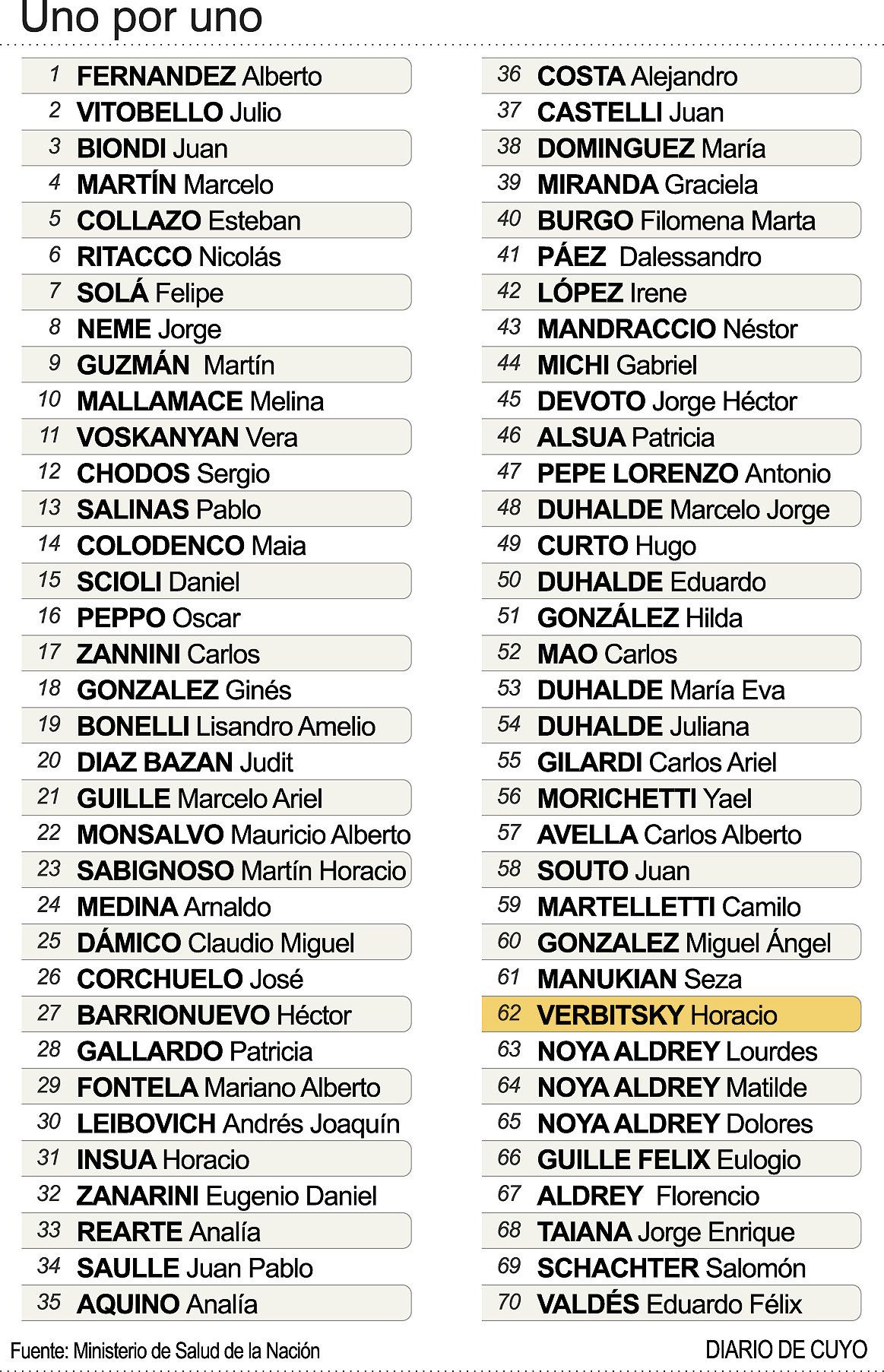 Según el listado difundido ayer, entre las 70 personas se incluyen las que fueron vacunadas por personal del bonaerense Hospital Posadas en instalaciones del Ministerio de Salud de la Nación el 18 de febrero de 2021. Entre ellos, Taiana, Valdés, Verbitsky, Félix Guille, el empresario Seza Manukian, el empresario Florencio Aldrey y sus familiares Lourdes Noya Aldrey, Dolores Noya Aldrey y Matilde Noya Aldrey, además de Salomón Schachter (traumatólogo señalado como amigo de Ginés González García, que renunció a la titularidad del Ministerio de Salud tras la polémica).