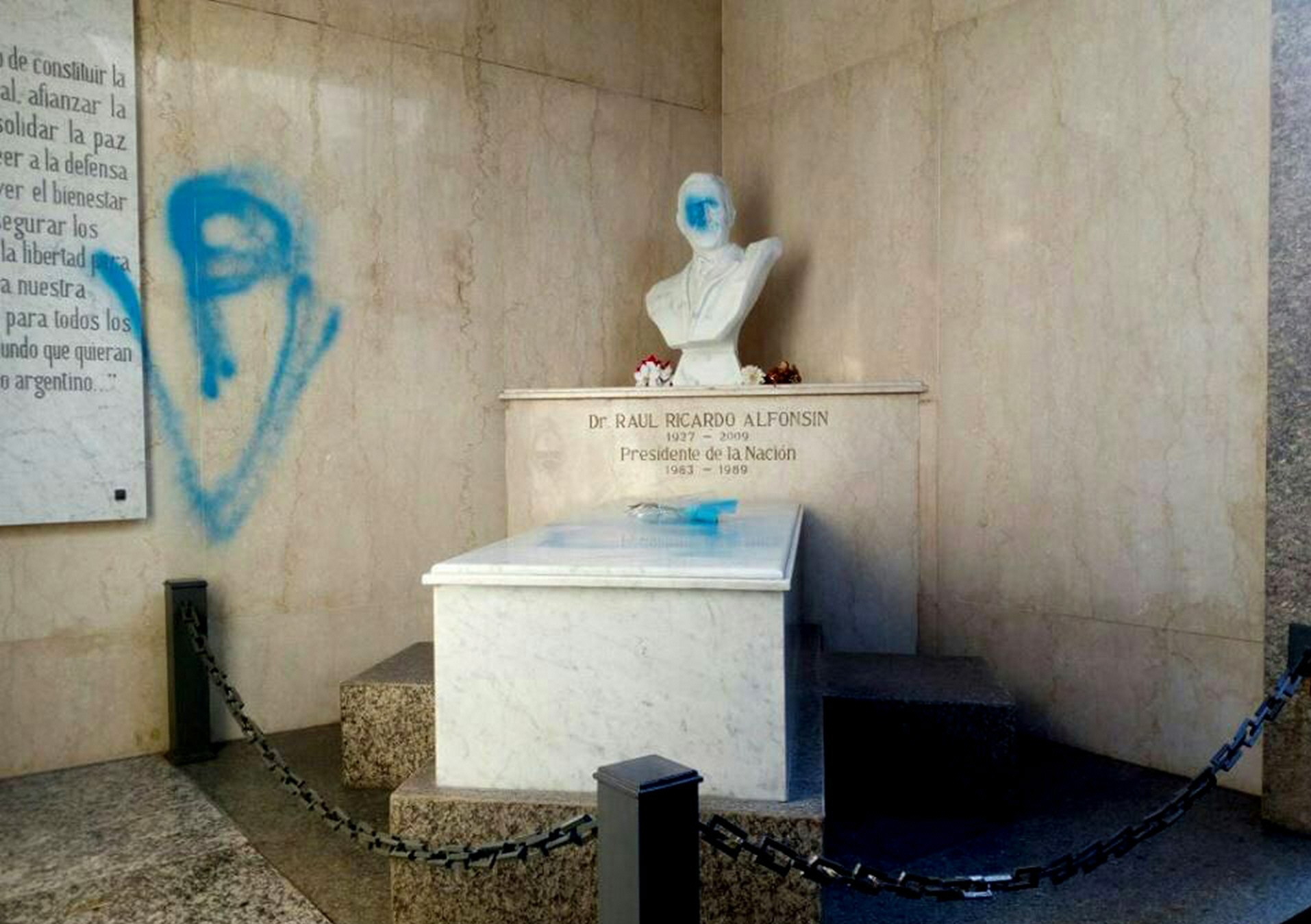 El mausoleo donde descansan los restos del expresidente Raúl Alfonsín amaneció ayer vandalizado en el cementerio de la Recoleta, con pintadas de aerosol celeste y consignas a favor del peronismo, hecho que generó un repudio generalizado entre la clase política, incluido el presidente Mauricio Macri.