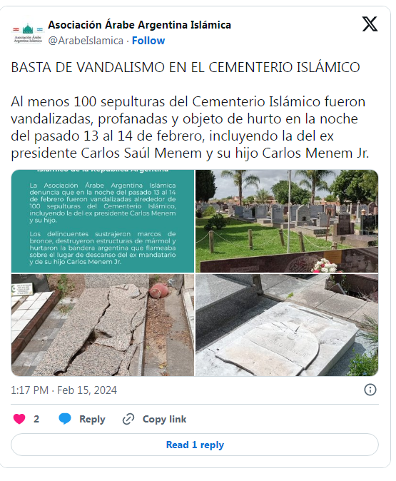 La Asociación Árabe Argentina Islámica denunció este jueves a través de sus redes sociales que fueron vandalizadas las tumbas del expresidente Carlos Menem y su hijo, Carlos Menem Jr., ubicadas en el Cementerio Islámico de la República Argentina situado en la localidad de San Justo, en el partido bonaerense de La Matanza.