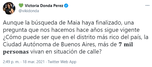 “Aunque la búsqueda de M. haya finalizado, una pregunta que nos hacemos hace años sigue vigente ¿Cómo puede ser que en el distrito más rico del país, la Ciudad Autónoma de Buenos Aires, más de vivan en situación de calle?”, expresó en Twitter.