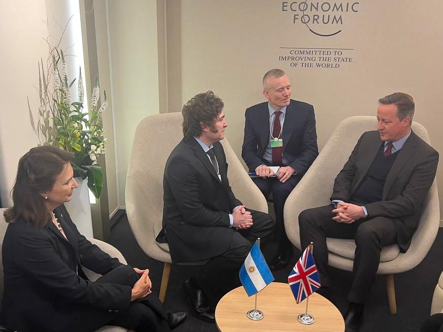 Javier Milei y David Cameron se reunieron en un pequeño salón del Foro Económico de Davos con el objetivo básico de reactivar las relaciones diplomáticas entre Argentina y Gran Bretaña. El encuentro duro 20 minutos, y junto al presidente estuvieron la canciller Diana Mondino y la secretaria General de la Presidencia, Karina Milei.