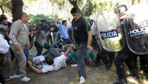 Buenos Aires, 26 de abril.- En medio de la demolición del taller Nº 19 del Hospital Borda, en el barrio porteño de Barracas, chocaron empleados de la institución contra la Policía Metropolitana, que acudió para desalojar el lugar y terminó desplegando una fuerte represión con palazos, gases lacrimógenos y balas de goma. Una de esas postas alcanzó al camarógrafo de C5N Mario Ricci.