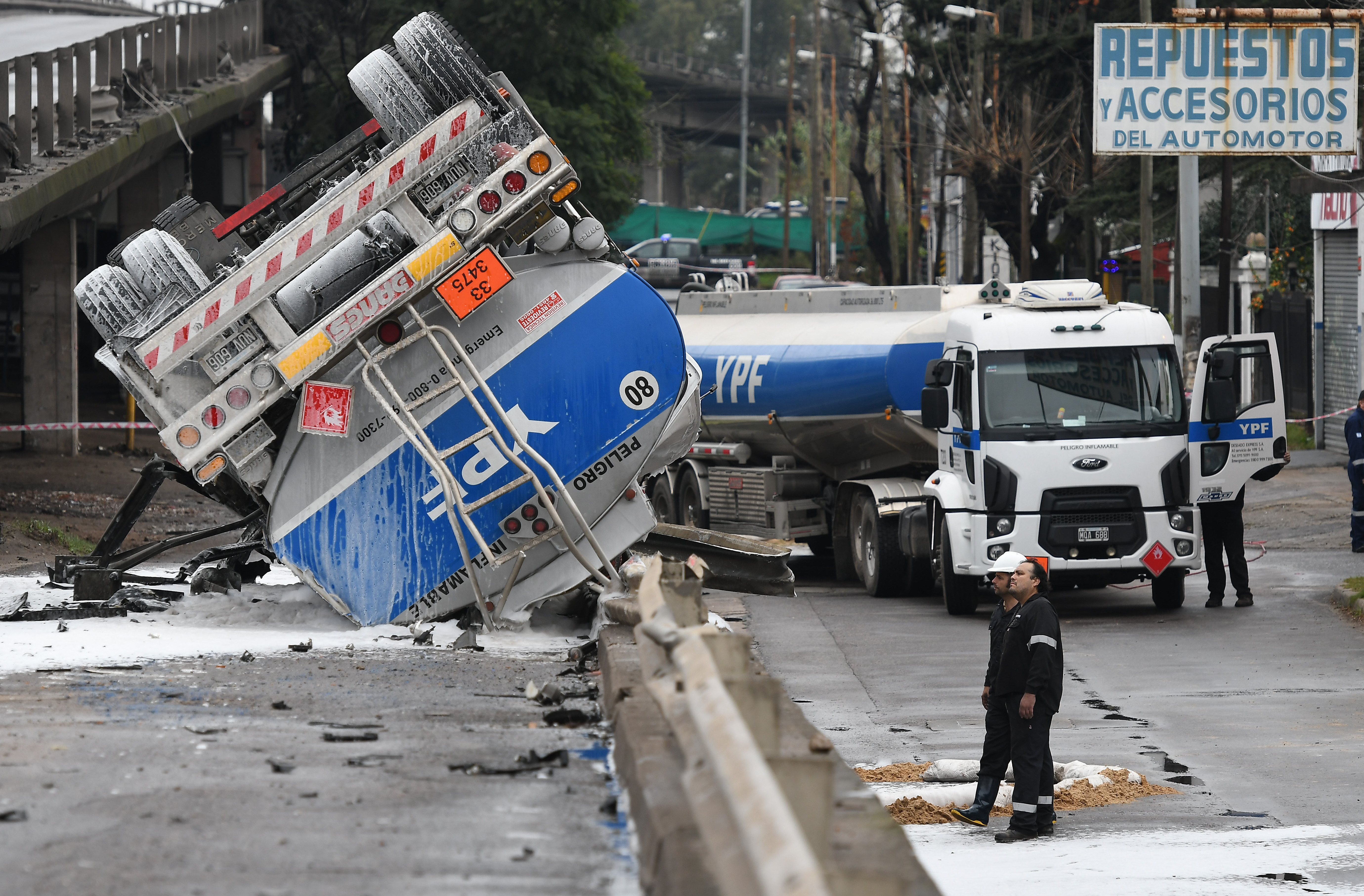 Un camión cisterna de la empresa YPF volcó al caer de un puente ayer en la mañana en la localidad bonaerense de Ciudad Evita, partido de La Matanza, y desparramó unos 9.000 litros de combustible en la traza del Camino de Cintura, por lo que personal de bomberos trabajaba para enderezar el vehículo y así poder retirarlo.