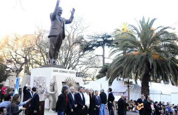 En el día que se cumplían 120 años del nacimiento de Perón (1895-1974), la presentación del monumento en una plaza frente al edificio de la Aduana congregó a dirigentes del PRO, y estuvo formada en gran parte con peronistas, sindicalistas y hasta por el expresidente provisional Eduardo Duhalde (2002-2003).