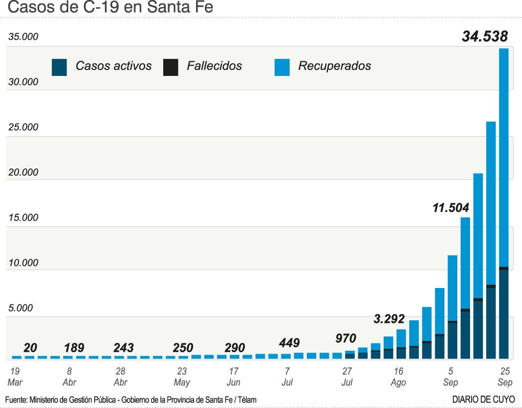 La provincia de Santa Fe pasó en los últimos dos meses y medio de registrar 425 casos de coronavirus a más de 34.000, lo que derivó en una ocupación del 97% de las camas de terapia intensiva del sector público en Rosario esta semana y causó "alerta" en las autoridades sanitarias por la "tensión" sobre el sistema de salud.