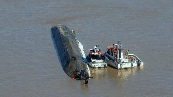 La nave, de 15 metros de manga (ancho), quedó recostada sobre el lecho del río en un lugar donde la profundidad es de doce metros, por lo que exhibe su lateral izquierdo sobre la superficie.