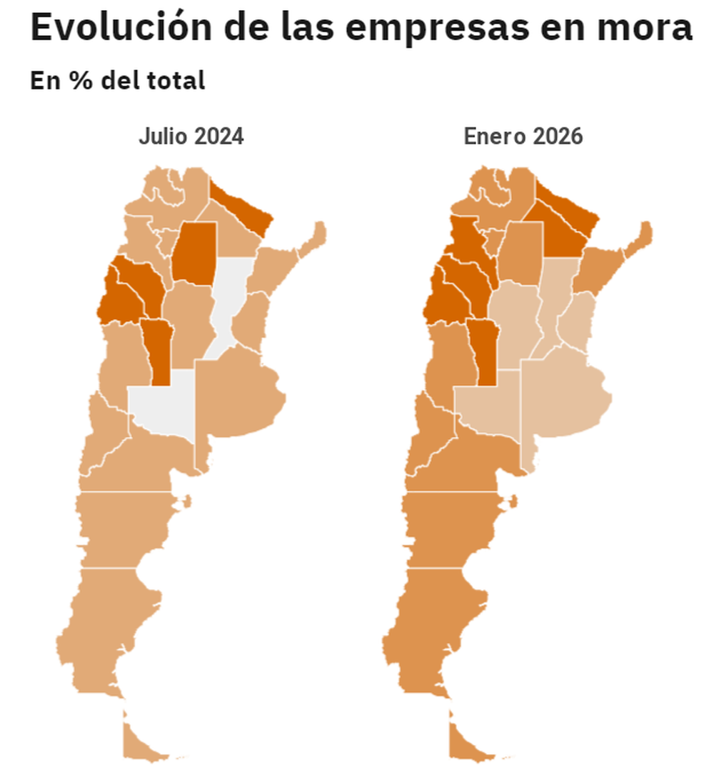 En cuanto al mapa del país, Santa Cruz encabezó el ranking de crecimiento en la cantidad de empresas con deudas en mora, con un aumento de 6 puntos porcentuales hasta alcanzar el 14,6%. La Rioja registró una suba de 5,6 puntos y Chubut de 5,4. El incremento de la morosidad también se observó en provincias con fuerte presencia petrolera y minera. En la Provincia de Buenos Aires, el porcentaje de compañías con atrasos subió 2,9 puntos y se ubica en 9,6%, casi 3 puntos por debajo del promedio nacional. En Formosa, más del 20% de las empresas presentan dificultades para cumplir con sus pagos. San Juan, San Luis y La Rioja también muestran niveles elevados, con tasas de 17,3%, 16,8% y 16,5% respectivamente.