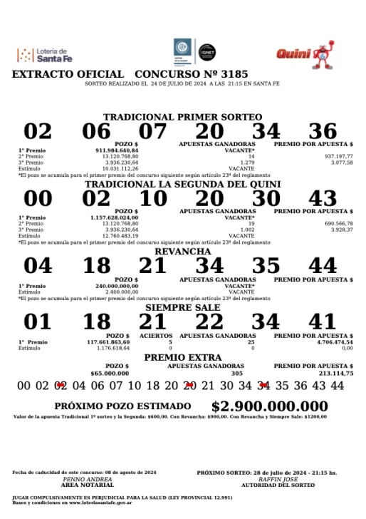 Extracto oficial concurso no 3185. Sorteo realizado el 24 de julio de 2024 a las 21:15 en Santa Fe