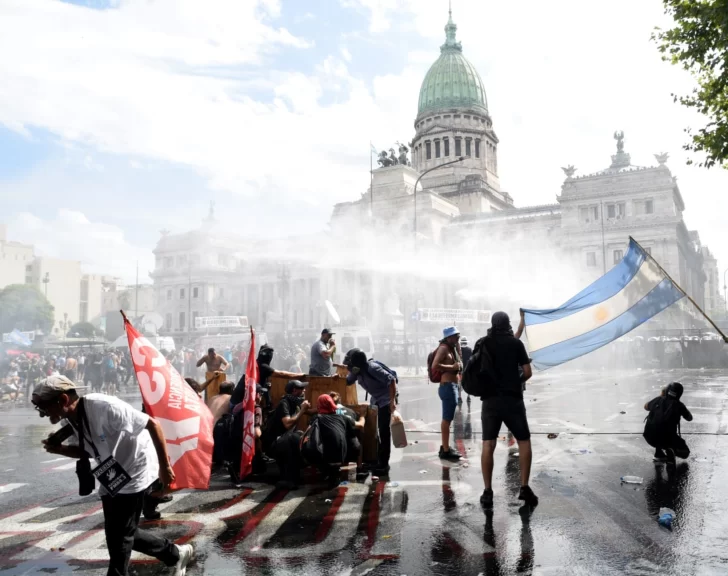 Las fuerzas respondieron con gas pimienta y el avance de un carro hidrante, lo que hizo retroceder a los manifestantes hacia Hipólito Yrigoyen. En medio del caos, parte del vallado fue derribado y reemplazado por un cordón de gendarmes con cascos y escudos.