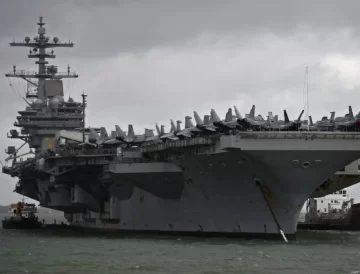 Debido a su tamaño (332 x 317 metros) no podrá amarrar en ningún puerto del país y permanecerá en aguas jurisdiccionales argentinas, escoltado por el USS Porter y el buque logístico USNS John Lenthall.