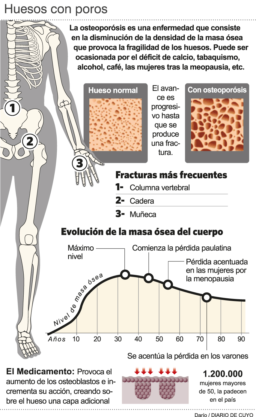 La osteoporósis se da con mayor frecuencia en la mujer, hasta en un 25% de las mayores de 65 años; mientras afecta al 6% de los varones. En gran parte de los casos puede alcanzar hasta un importante extremo, sin que se presenten molestias; y cuando estas aparecen, lo hacen en forma de dolores, fracturas y deformaciones.