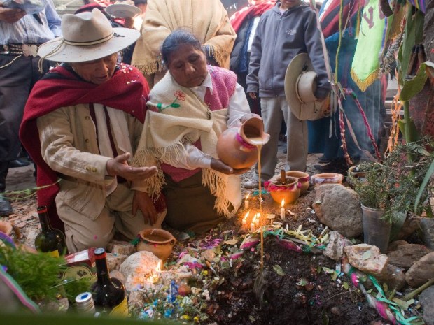 Dice Manuel Marzal que el panteón andino actual está constituido de forma sincrética, es decir que la religión católica se sintetiza con la andina. Existe Dios, los santos (esto es Jesucristo, las advocaciones marianas y los santos canonizados). Por otra parte, se nos presentan diferentes seres sobrenaturales andinos como los cerros o "apus", y la Pachamama o "madre tierra". Respecto a esta representación mítica, se la considera como una mujer, bondadosa, vigorosa, sin forma concreta y es el principio de la fertilidad. Es venerada en Ecuador, Perú, Bolivia, parte de Chile y en las provincias del noroeste argentino. Cabe aclarar y siguiendo rigurosos estudios de la protohistoria local, que los huarpes nunca veneraron a la Pachamama, no obstante, la conquista inca. Siguiendo con el tema en cuestión, la "madre tierra" tuvo gran popularidad en el Incario o Imperio inca. Adolfo Colombres expresa que la "palabra ‘pacha’ designó en un principio sólo un tiempo o edad del mundo, para pasar luego a referirse a un lugar o espacio y a la misma tierra generadora de la vida y fecundidad". La gran fiesta se le celebra el 1 de agosto, este es el día de la "corpachada" (corpachar: dar de comer y beber a la tierra), una demostrativa y solemne práctica ritual que comienza con una plegaria a través de la cual se establece un compromiso sagrado entre el hombre y la Pacha que los dos están obligados a cumplir. Luego de esta invocación se continúa con la principal parte del ritual. Se prepara comida, se elabora chicha, además se adquiere coca y cigarrillos. Los creyentes arrodillados depositan parte de estas ofrendas en un hoyo cavado en ciertos sitios como puede ser un lugar de la vivienda, a la orilla del camino o en la cercanía de una vertiente. A estos espacios se los suele denominar "apachetas", considerados como templos. De esta manera las ofrendas brindadas pasan a formar parte de la "madre tierra". Finalizada esta ceremonia los creyentes ahuman la tierra y se retiran serenos porque la Pacha ha quedado complacida. Para los indígenas andinos, la Pachamama es además la encargada de madurar los frutos, acrecentar el número de ganado. Se acostumbra a invocarla en tiempos de sembradíos, ante posibles contingencias climáticas y para proteger a los caminantes de la puna o el "soroche". También se dice que es muy solapada y vengativa con los incrédulos e desagradecidos sobre todo con los que no "corpachan".