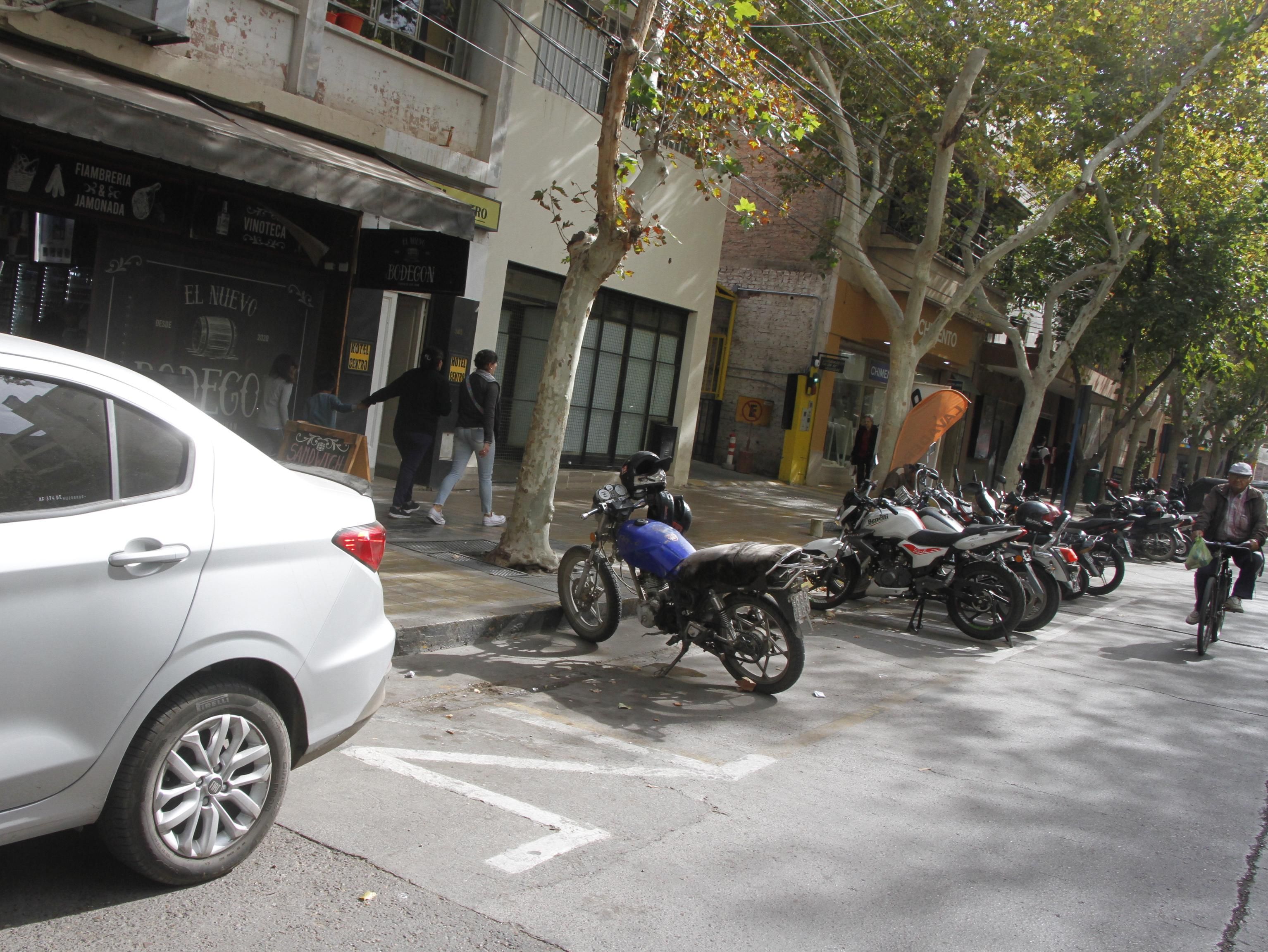 Como se ve en la foto, esta moto está estacionada en un espacio no permitido para esta clase de rodado. Al lado de este vehículo están los pequeños estacionamientos para motos que en toda la ciudad están abarrotados, durante gran parte del día. Este ya es un problema crónico para los motociclistas, es decir la falta de estacionamientos exclusivos para las motos con espacios un poco más grandes, debido a que no entran en las líneas demarcatorias que el municipio hizo para ese fin. Esto requiere la atención municipal para solucionar una situación muy fácil de corregir y es la asignación de mayor cantidad de espacios para estacionamiento de motos, para evitar estacionar en las veredas y para mayor comodidad de todos quienes transitan por el centro de la capital sanjuanina.