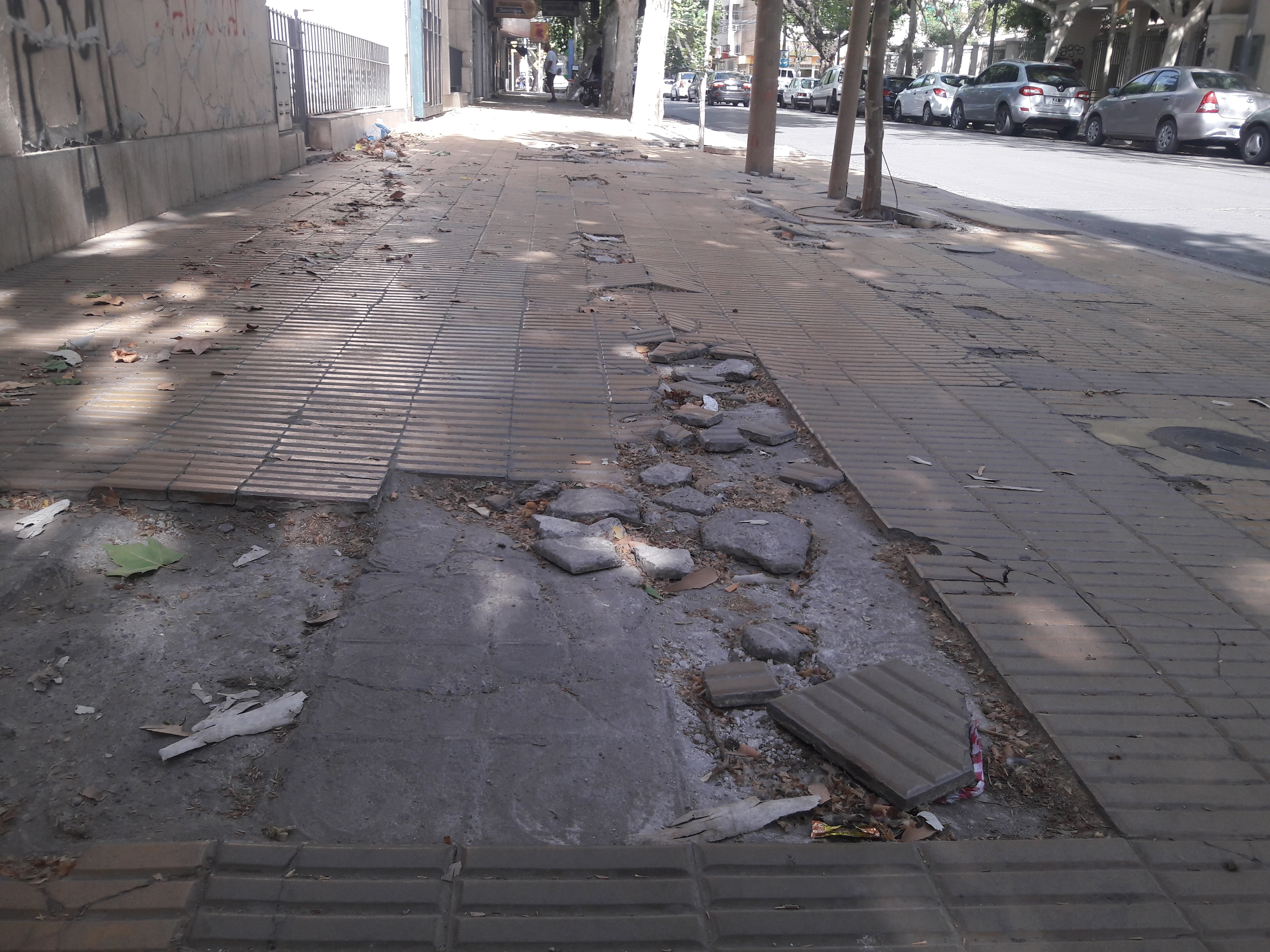 Sea por la razón que fuere, las veredas públicas de todos los departamentos de la provincia deben estar en buen estado de transitabilidad para los peatones. Pero a veces, esto no sucede. Quienes ya transitamos varias décadas de vida, observamos y sufrimos con pesar, cada vez más decadencia en la capital de los sanjuaninos. Cada año, cada lustro, cada década que pasa, se nota la falta de cuidado en todo lo que tiene que ver con los espacios públicos. Se inauguran , se cuidan un tiempito, pero los vándalos atacan. Falta vigilancia y sanciones para los destructores de los bienes de toda la ciudadanía. Basta con ver esta imagen cercana al Colegio Nacional Monseñor Pablo Cabrera, donde las baldosas están tan destrozadas que parecen molidas. Esto me hace recordar que hace un par de años, dos profesoras de esta institución educativa sufrieron caídas que les trajo como consecuencia fracturas en sus pies, que seguramente les trajo graves consecuencias para su salud.