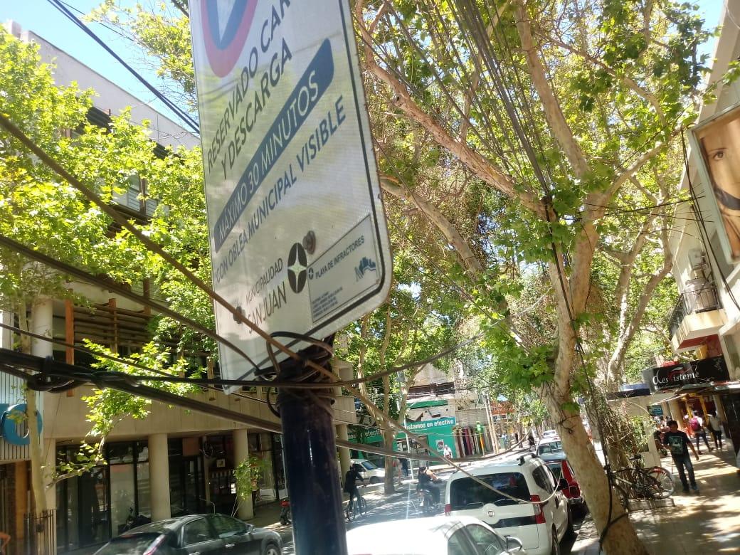 En la foto sacada en la vereda Oeste de calle Mendoza casi Santa Fe, puede observarse un serpenteo de cables que bajan de árboles, se trepan en carteles que hasta impiden en cierta forma la visualización de la información, y siguen hacia otro árbol. Todos prolijamente atados en algunos lugares. Pero, esta situación que describo también se manifiesta en diferentes lugares de la ciudad y del microcentro desde hace ya varios años, sin que las autoridades correspondientes hicieran algún tipo de acción para quitar esta maraña de las veredas.