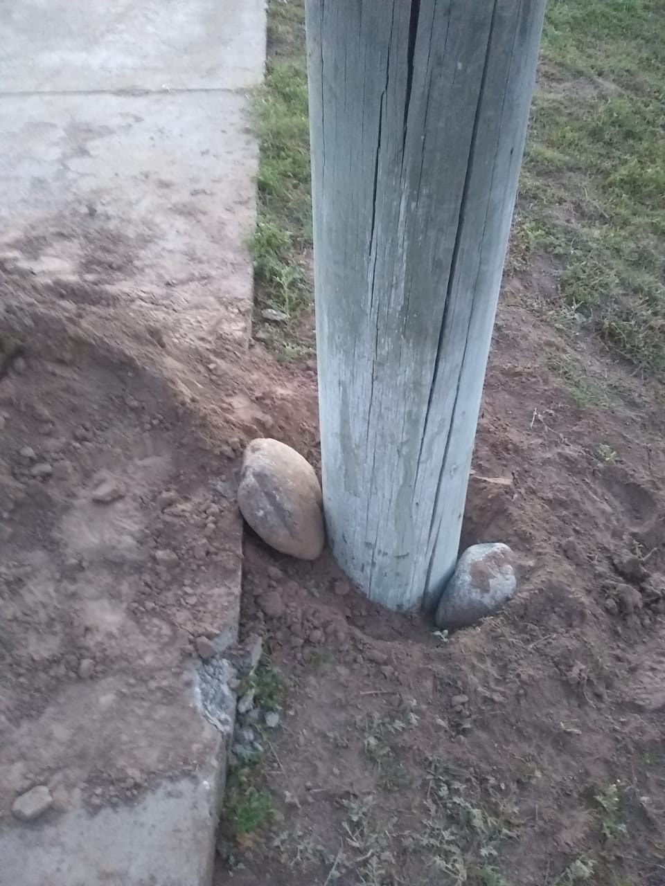 No obstante se hizo una reparación muy provisoria que incluyó la colocación de unas piedras en la base del tronco. Ahora estamos rogando que no vaya a correr viento, ni llueva, ni tiemble ya que por cualquiera de estos motivos los postes se pueden volver a caer, y si lo hacen arriba de una cabaña puede ser muy peligroso. Es lamentable que esto esté ocurriendo en el interior de la provincia.
