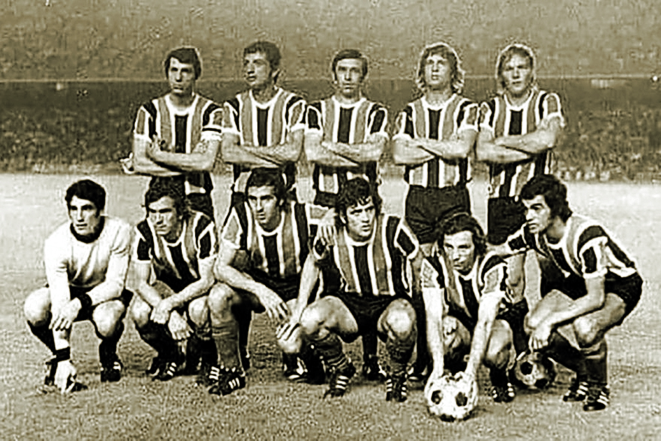 Chacarita Juniors en 1971, cuando le ganó 2 a 0 al Bayer Munich. Arriba, al medio, el sanjuanino Luis Recúpero.