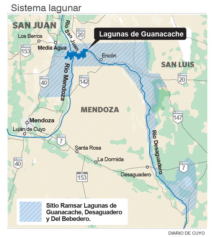 Con aguas provenientes del río Mendoza, las lagunas de Guanacache ubicadas en el límite entre San Juan y Mendoza comenzaron a recibir el pasado viernes un considerable caudal después de casi 10 años de absoluta sequía. Con el llenado de las lagunas laterales y de la laguna grande, en la zona de la capilla de Lagunas del Rosario, volvió la alegría para los lugareños entre los que se encuentran habitantes de las comunidades huarpes.