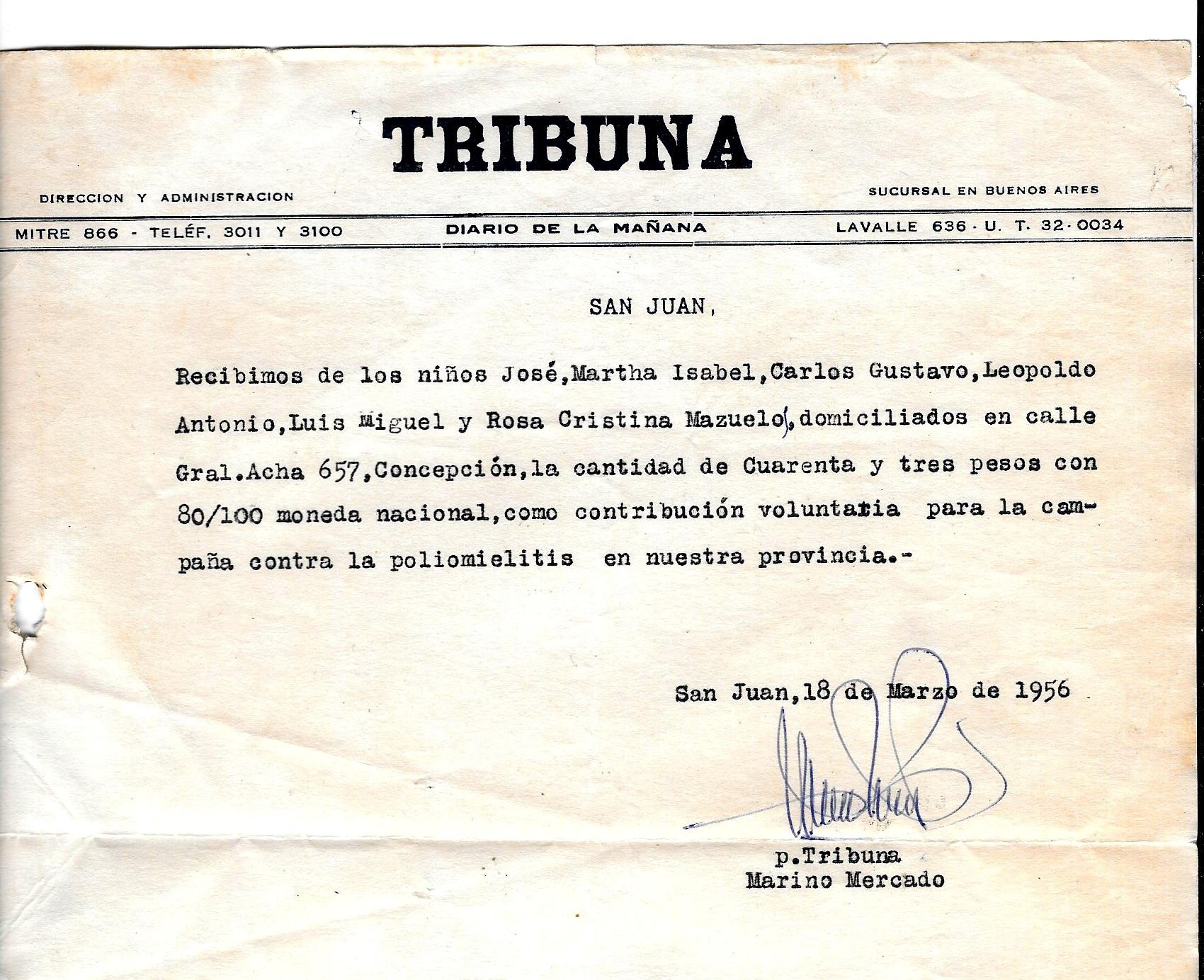 La poliomielitis en su momento afectó en especial a los niños, quienes sufrían parálisis en su cuerpo, piernas, brazos. Impedía tragar y respirar, por o que provocaba la muerte. La vacuna con la que la ciencia la combatió, terminó con esa enfermedad mortal que se ensañó con los niños. A mediados de la década de 1950, San Juan se suma a una campaña a nivel nacional y que a través del entonces "Diario Tribuna” (Diario de la Mañana), se llevó a cabo en toda la provincia. Se sumaron cientos de niños sanjuaninos en favor de otros niños que con sus donaciones económicas ayudaron a combatir para erradicar la "polio”. El Diario Tribuna publicaba en sus páginas la foto de los niños que llevaban sus donaciones y entregaba un recibo, para que con el tiempo (han pasado 68 años) el espíritu solidario sea un grato recuerdo y decir: "yo colabore para la erradicación de la "parálisis infantil”. Recibo que todavía conservo junto a la foto. En aquellos tiempos los padres inculcaban a sus hijos valores éticos y morales como la solidaridad, el ayudar al que sufre una enfermedad o está pasando un mal momento, ya sea económico o de salud, quedando como conducta hasta que nos morimos.