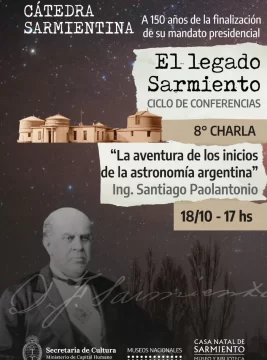 Los invitamos a la charla “La aventura de los inicios de la astronomía argentina”, donde el Ing. Santiago Paolantonio explorará el papel fundamental de Sarmiento en los estudios astronómicos del país y sus iniciativas, como la creación del Observatorio Astronómico de Córdoba. La actividad se llevará a cabo principalmente de forma virtual, debido a que el conferencista se encuentra en Córdoba, por lo que podrán acceder a la misma directamente a través del canal de YouTube de Si San Juan. Si desean asistir de manera presencial, también pueden hacerlo en la Biblioteca del museo. Esta charla forma parte de “El Legado Sarmiento: A 150 Años de la Finalización de su Mandato Presidencial”, un ciclo de conferencias de la Casa Natal de Sarmiento con resolución ministerial, que aborda diversas temáticas relacionadas con la vida y obra de Domingo Faustino Sarmiento.
