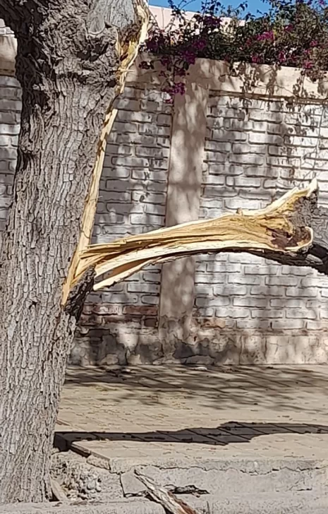 La situación de la arboleda urbana en todo el Gran San Juan es preocupante, prácticamente no hay sitios donde no podamos encontrar árboles en muy mal estado o que pronto lo estarán a consecuencias de diversas circunstancias provocadas por los mismos vecinos o los responsables municipales encargados de velar por esos árboles. Como ejemplo tenemos un árbol en el Barrio Bardiani al que se le ha caído una rama y que se encuentraasí desde hace tiempo (foto). Por otro lado en pleno centro hay un ejemplar de mora junto al cual está creciendo una palmera que si non es extraída a la brevedad pronto terminará afectandola, además que la palmera crecerá a tal punto que después costará mucho erradicarla. Finalmente tenemos el estado en que se encuentran varios ejemplares de plátano frente a la Municipalidad de la Capital cuya tasa ha sido tapada con material de relleno o cemento, según dicen para que la gente no se caiga en el lugar. Tres ejemplos de lo que no hay que hacer con el arbolado público.