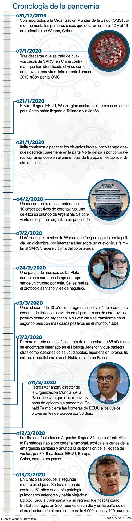 En ese escenario mundial, el Gobierno argentino se encuentra a medio andar, como casi siempre. Recién asumidos, los hombres y mujeres del Frente de Todos están a mil manos tratando de atajar el día a día y haciendo camino al andar, porque pocas veces la humanidad padeció circunstancias similares. Al menos pocas veces en la historia reciente. No hay muchos libros que revisar. Para colmo, en un momento político externo e interno bastante incómodo: la renegociación con los acreedores por la deuda pone al país en peligro de default y los roces puertas hacia adentro de un gobierno que nació agrietado complican la toma de decisiones y los esfuerzos en grupo. Quizás esta coyuntura nacional explique alguna demora en la toma de decisiones, como la de no prohibir a tiempo el ingreso de vuelos, algo de lo que habló la ministra de Salud sanjuanina, Alejandra Venerando, en una extensa entrevista que publica este diario en páginas 10 y 11. En ese "debe" probablemente haya que anotarle al gobierno de Fernández la falta de visión para haber empezado a tratar el tema allá por enero de este año, cuando la Organización Mundial de la Salud ya hablaba de una epidemia con riesgo de expandirse a todo el globo (ver Cronología). Es cierto que es fácil sacar conclusiones con el diario del lunes, pero también es real que hay muchos ejemplos en el mundo de países que actuaron con mayor firmeza, que lograron contener con mayor éxito la invasión del Covid-19.
