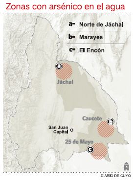 Si bien los casos más graves han sido detectados en la zonas Noroeste y Norte del país, la provincia de San Juan figura entre los puntos donde se observa la presencia de arsénico en el agua, aunque en niveles moderados. En la Secretaría de Medio Ambiente de la provincia, tienen monitoreado los sitios en los que se detecta la presencia de arsénico en el agua a fin de determinar periódicamente si los niveles no son perjudiciales para la salud. Se han detectado zonas de agua con arsénico en el Norte de Jáchal; en la zona de Marayes, en Caucete y, en menor medida, en la zona de El Encón, en 25 de Mayo. En cada uno de estos sitios el Gobierno de la provincia implementó sistemas de potabilización del agua, realizando acuíferos desde zonas no afectadas, aunque, lógicamente, siempre quedan pequeños caseríos o viviendas aisladas, a las que todavía no se llega con una solución efectiva.
