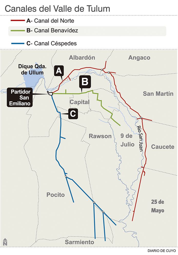 Este diario pudo comprobar en el propio terreno la inoperancia que en ocasiones predomina cuando se realizan tareas de limpieza cerca de los canales. En las inmediaciones del Canal del Sur o Céspedes una cuadrilla de obreros municipales de Rivadavia utilizaba este cauce para arrojar todo tipo de basura, especialmente botellas de plástico, bolsas de polietileno, trozos de telgopor, y cajones de madera que iba encontrando a su paso, sin tener en cuenta la contaminación de ese curso hídrico y los taponamientos que se producen más adelante. Algo similar se pudo observar en un tramo del canal Benavídez, también conocido como del centro o Ciudad, que recorre una amplia zona entre Capital, Chimbas y Santa Lucía, donde cuadrillas municipales de estos dos últimos departamentos fueron observadas arrojando residuos, especialmente material orgánico, que al descomponerse provoca feos olores que afectan el ambiente. Esto mismo ocurre en varios puntos de la red de canales o red de riego del valle de Tulum, un sistema que tiene su origen en los diques de Punta Negra y Ullum; el dique nivelador José Ignacio de la Roza y el Canal General Matríz que al llegar al Partidor San Emiliano, da lugar a tres canales matrices, el del Norte o Quiroga; del Centro o Ciudad y del Sur o Céspedes. A partir de ellos se ramifica en secundarios y terciarios alcanzando los doce municipios del Valle de Tulum.